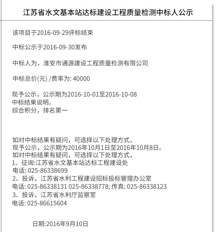 关于我公司参与江苏省水文基本站达标建设工程质量检测投标并中标